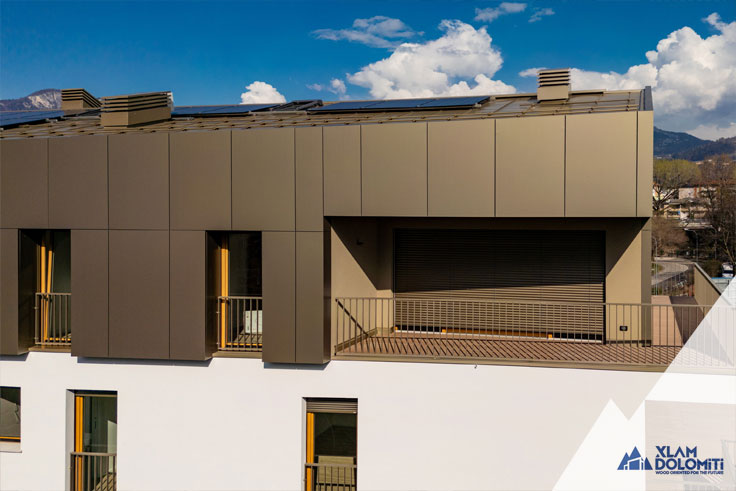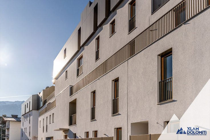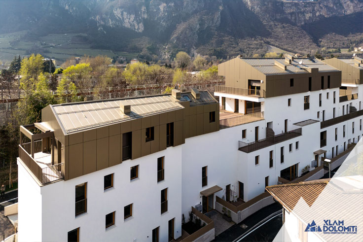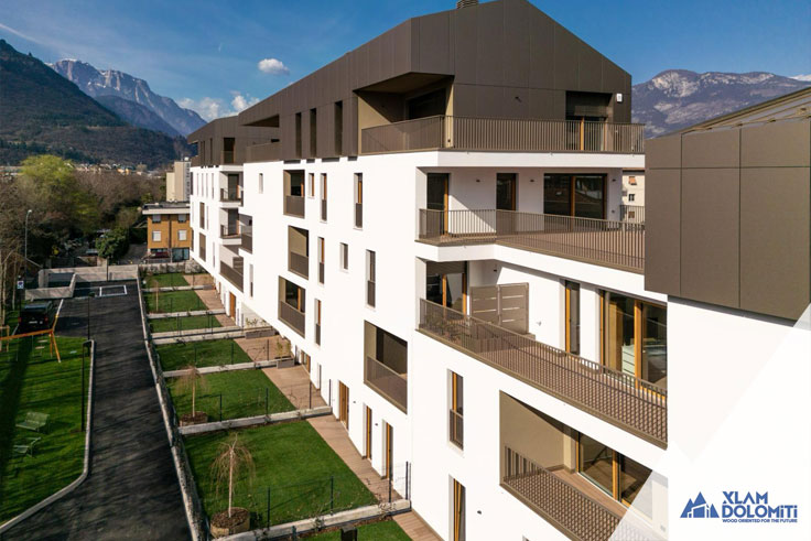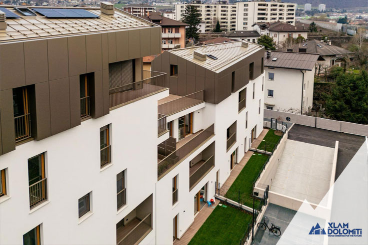 This modern and elegant residence, built with Cross-Laminated Timber (CLT), consists of three interconnected buildings on the ground and first floors. Buildings A and B, each with five above-ground floors, accommodate 12 and 15 units of various sizes, respectively, all featuring private loggias, terraces, or gardens. Building C, developed over four above-ground floors, houses eight exclusive units.The available unit sizes vary, ranging from one-room apartments to four-room residences.
